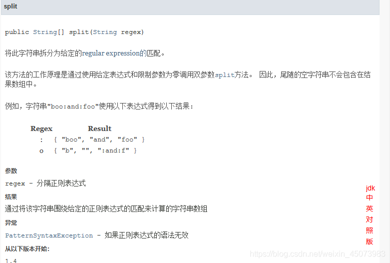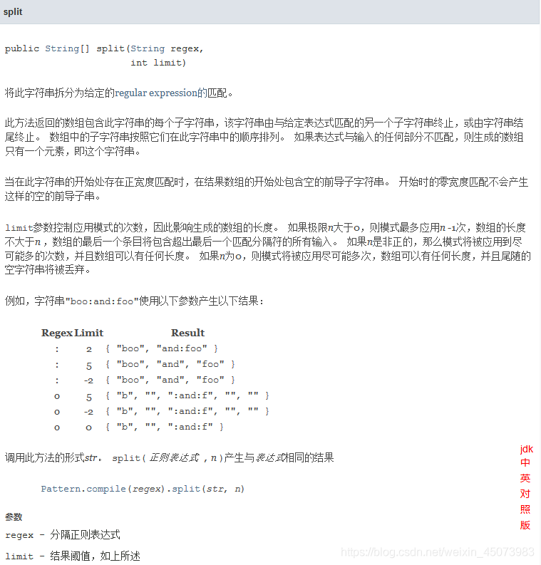 首先对java-JDK-1.8的文档进行解读,以下是我从文档中截取的两张图片,分别是关于split单参数方法与split双参数方法,如下图: