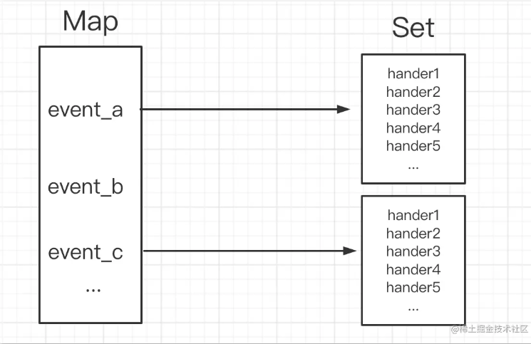 每一个Event都可以注册多个处理函数,我们用一个Set来保存这些处理函数,再用一个Map来保存Event到对应Set的映射,如图所示: