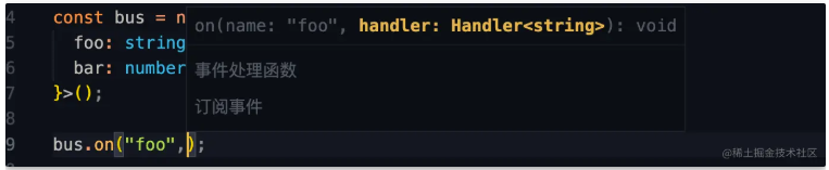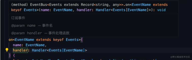 我们又将on方法设置为泛型函数,同时约束EventName extends keyof Events,这样一来Events[EventName] 就是对应值的类型,Handler<Events[EventName]>就是处理函数的类型。通过这样的方式我们实现了一个类型安全的on方法。