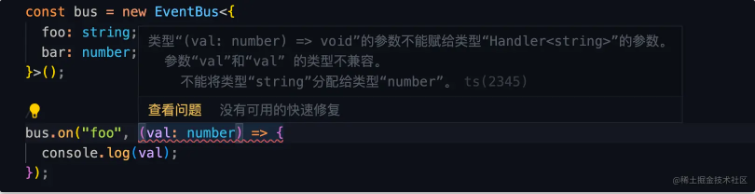 我们键入handler函数,编辑器也会提醒我们val是一个string类型。