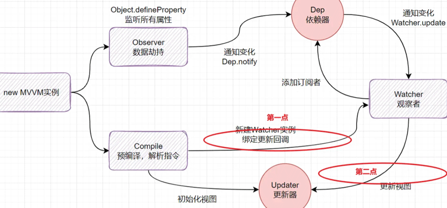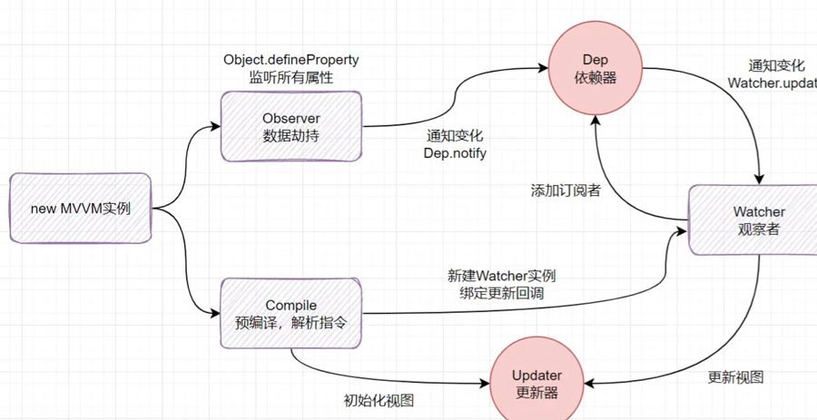 怎样将上面的编译和响应式整合到一起形成一个完整的具有响应式的miniVue类呢。其实很简单,从我们最上面那张图就可以看出来。总结一下就两点,在我们通过各种指令操作node节点的时候,同时初始化watcher,另一点即为初始化watcher时指定的回调内部需要执行updater里面对应的方法来更新视图