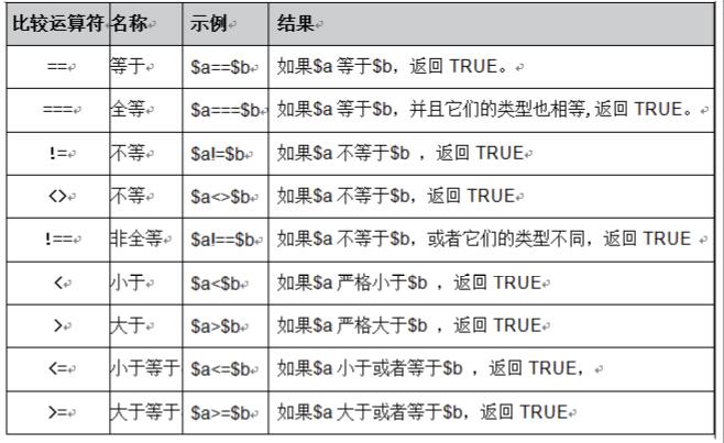 比较运算符主要是用于进行比较运算的,例如:等于、全等、不等、大于、小于。在PHP中常用的比较运算符如下表: