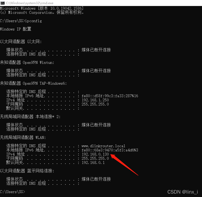 在控制台中输入 ipconfig 找到电脑的IP地址