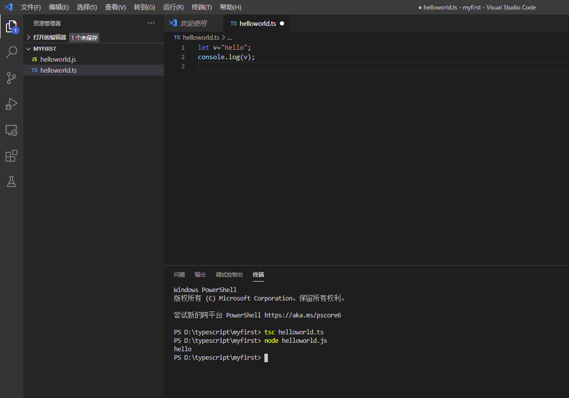 进入控制台,输入 tsc hello.ts,会生成对应的hello.js,输入node hello.js,会运行代码。