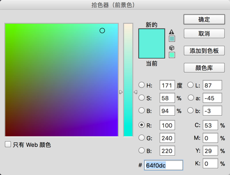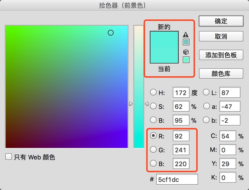 如下图中,我们作图时,设置的RGB值分别为100/240/220 但是通过CG上述处理时,读取出来的值则为92/241/220。对比图中的“新的”“当前”,基本看不出色差。这点小问题各位知道就好,对实际去色效果影响并不大