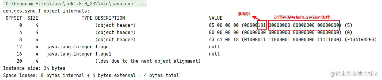 可以看这个程序的执行结果,当前的锁状态是偏向锁,而有意思是的锁存在,但是他并没有指向线程的指针,