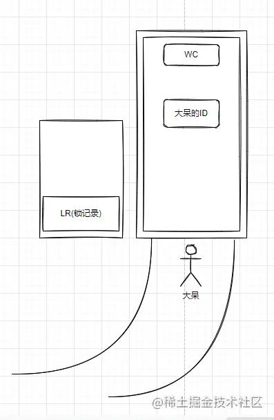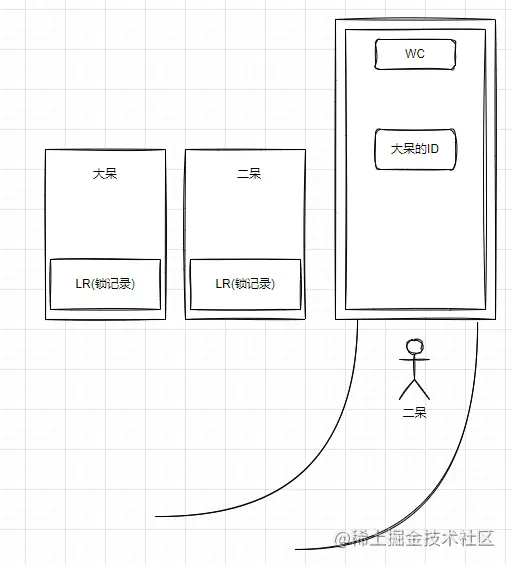 因为此时锁的状态是偏向锁的状态,二呆来了也要使用WC(这时有两个人同时要使用WC,这时就要将偏向锁升级成轻量级锁),在升级轻量锁之前首先需要将WC上的标识大呆身份的ID撕下来(这一步叫做偏向锁的撤销),然后能过自旋 CAS的方式两个人来抢锁。当其中一个线程抢锁成功后,会将LR贴到WC的门上,表示WC当前被某个线程占用,然后另一个没有抢到锁的线程就一直自旋,当自旋一定次数后升级成重量级锁。