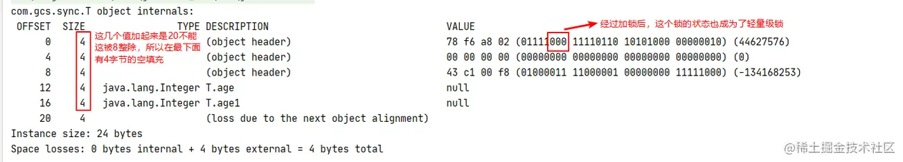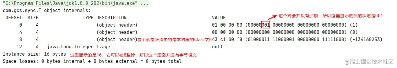 通过synchronized后的对象布局是什么样子的呢?这次再修改下T类,目的是让它存在字节填充