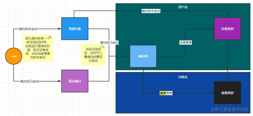 - 偏向锁未启动,创建出来的是普通对象, 如果有一个线程来抢占锁,该锁偏向此线程,这时升级为偏向锁。- 在偏向锁的基础上又来一个线程抢占锁此时升级为轻量级锁。当一个线程没有抢占到锁,并且自旋了一定时间后还没有抢到锁,就会升级成重量级锁。