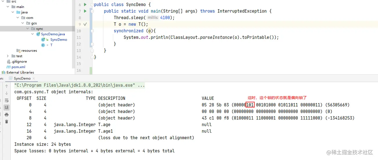 因为偏向锁是有4秒的延迟的,所以如果想要看到效果可以在代码里加上sleep(4100)就可以了。或者是通过jvm参数-XX:BiasedLockingStartupDelay=0将延迟设置成0