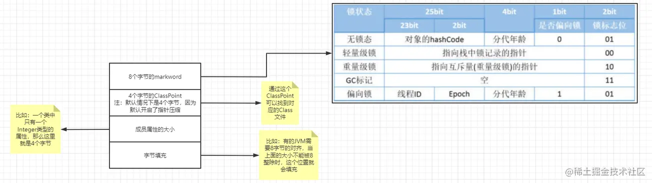 - 8个字节的markword,(markword里面包含了其它的东西,比如GC标记,锁类型)