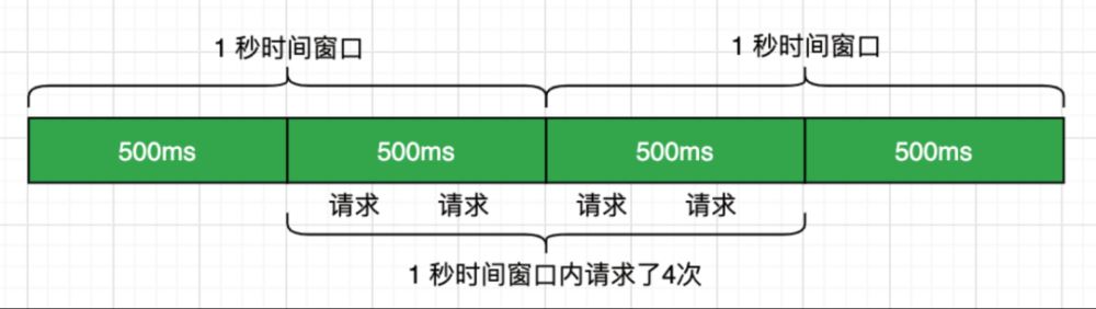 从输出结果中可以看到大概每秒操作 3 次,由于限制 QPS 为 2,所以平均会有一次被限流。看起来可以了,不过我们思考一下就会发现这种简单的限流方式是有问题的,虽然我们限制了 QPS 为 2,但是当遇到时间窗口的临界突变时,如 1s 中的后 500 ms 和第 2s 的前 500ms 时,虽然是加起来是 1s 时间,却可以被请求 4 次。