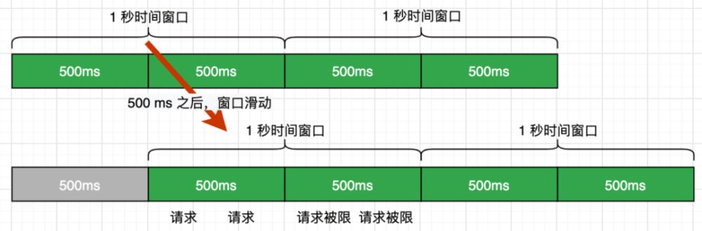 我们已经知道固定窗口算法的实现方式以及它所存在的问题,而滑动窗口算法是对固定窗口算法的改进。既然固定窗口算法在遇到时间窗口的临界突变时会有问题,那么我们在遇到下一个时间窗口前也调整时间窗口不就可以了吗?