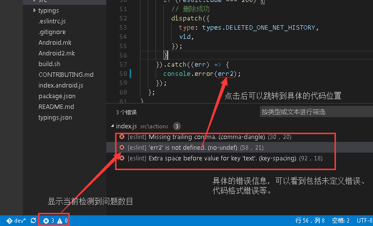 vscode中安装了对应插件后,就可以实时在编辑器上看到检测结果,不用自己运行CLI。