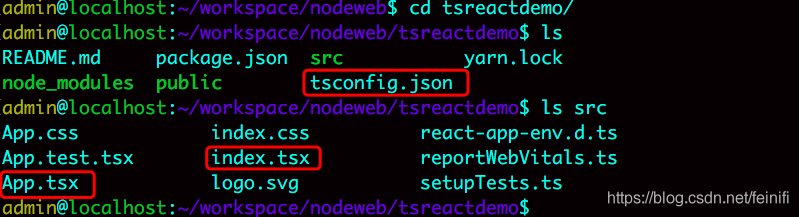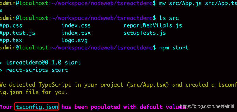 当我们修改了index.js,App.js文件为index.tsx,App.tsx之后,npm start 或 yarn start,默认会创建一个文件tsconfig.json,这也是官方明确说明的,我们没有必要手动创建tsconfig.json。