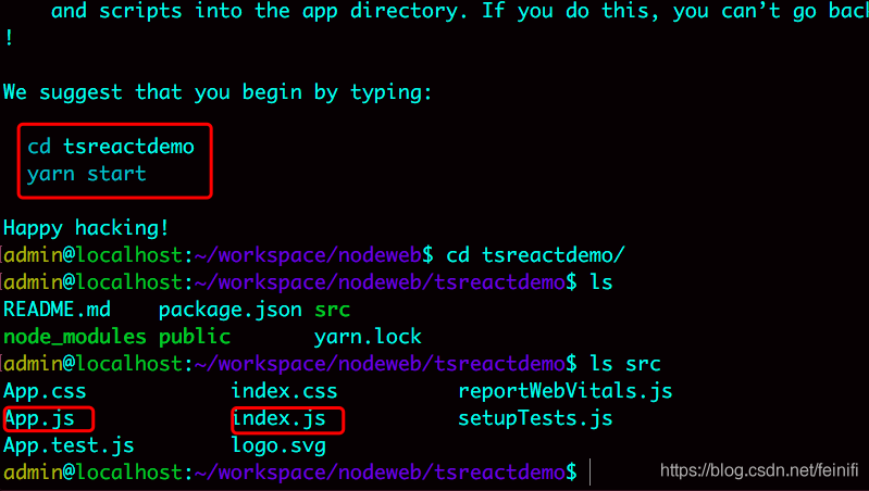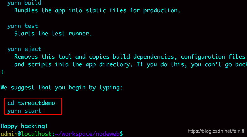 创建完成的成功提示与原来没有太大的区别,直接进入项目路径下,然后yarn start或者npm start。