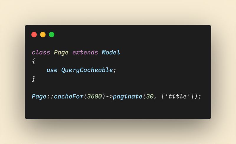 use QueryCacheable;  protected $cacheFor = 180; // 3 minutes