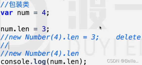 原始值不能有属性和方法(num不能加llen),对象可以有,如上, 那为什么原始值可以被调用,因为经历了个过程叫包装类,中间的蓝色字是隐式发生的,新建一个数字对象,让这个数字对象的len等于3,这步完事就被删除