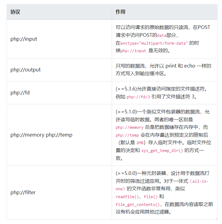 在ctf中常用的有data:// , php://input , php://filter ,file://