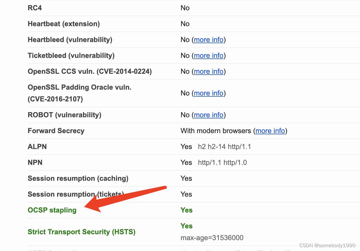 Protocol Details一节中,可以找到网站是否支持OCSP stapling的具体信息,如下所示: