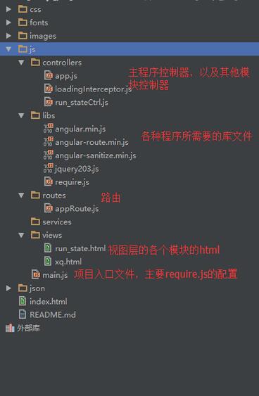 <div class="main"> <div class="header"> <div class="right-bar"> <span class="welcome">当前用户:<b>...</b> <button class="btn btn-info btn-xs"><i class="fa fa-sign-out"></i> 注销</button></span> </div> </div> <div class="mainContent has-shadow"> <div ng-view></div> </div> </div> <script data-main="js/main" src="js/libs/require.js"></script>//只要引用main和require.js