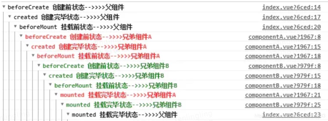 - 从上图可以看出,在父兄子组件挂载前,各组件的实例已经初始化完成。