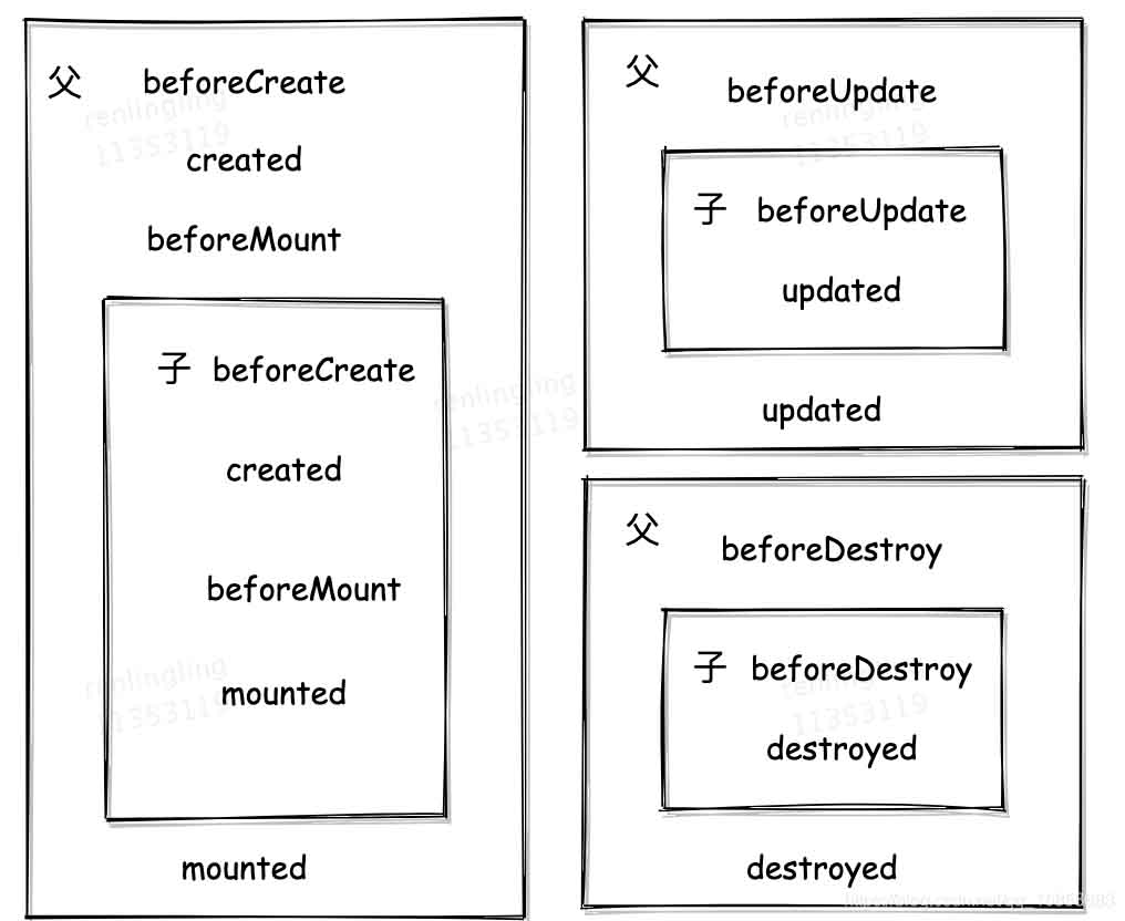 父beforeCreate->父created->父beforeMount->子beforeCreate->子created->子beforeMount->子mounted->父mounted