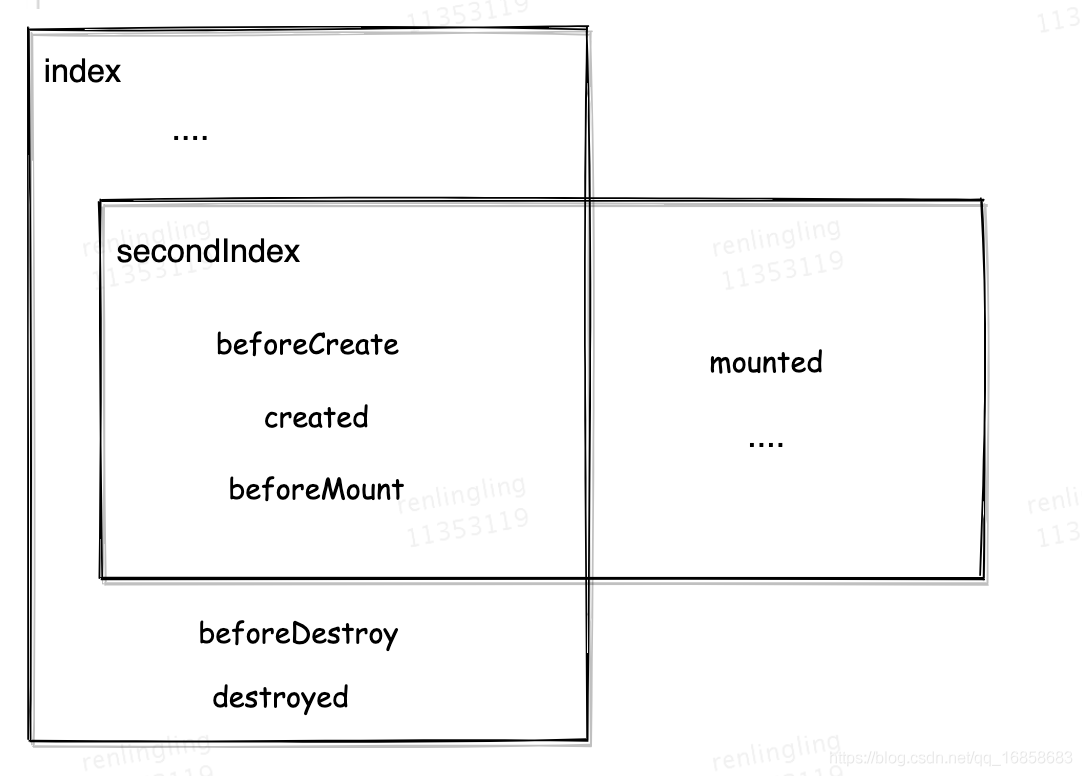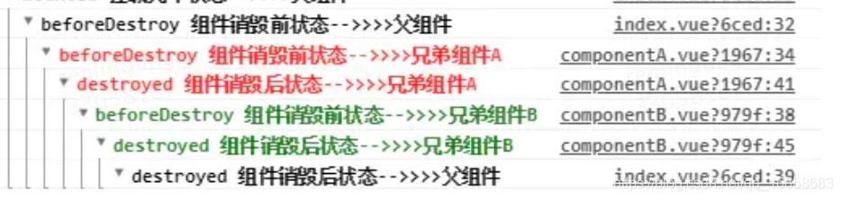 父组件被销毁时子组件也同时被销毁,销毁的钩子过程是:父beforeDestroy->子beforeDestroy->子destroyed->父destroyed
