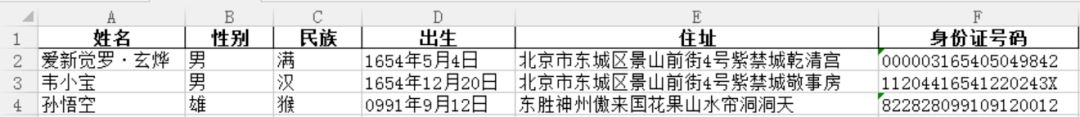 df = pd.DataFrame(data, columns=["姓名", "性别", "民族", "出生", "住址", "身份证号"])
