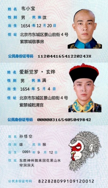 ['姓 名 韦小宝', '性 别 男', '民 族汉', '出 生', '1654 年12', '20日', '住 址 北京市东城区景山前街4号', '紫禁城敬事房', '公民身份证号码', '112044165412202438']