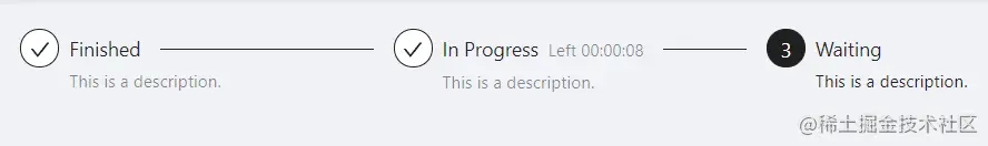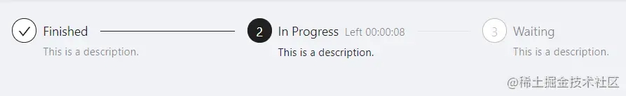 <Step title="In Progress" subTitle="Left 00:00:08" description="This is a description." />