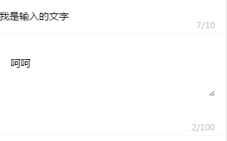 <input type="text" value="我是输入的文字" maxlength="10" id="detail1"/> <p><span id="detail1_num">0</span>/<span>10</span></p> <textarea placeholder="最多输入100字" rows="3" maxlength="100" class="editDetail" id="detail2" >呵呵</textarea> <p><span id="detail2_num">0</span>/<span>100</span></p>
