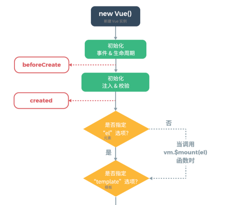 在实例创建完成后被立即调用.在这一步,实例已完成以下的配置:数据观测 (data observer),属性和方法的运算,watch/event 事件回调。然而,挂载阶段还没开始,$el 属性目前尚不可用。