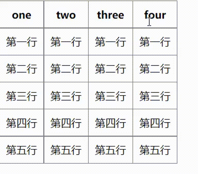 <table border="1" cellpadding="10px" rules="all"> <thead> <tr> <th>one</th> <th>two</th> <th>three</th> <th>four</th> </tr> </thead> <tbody> <tr> <td>第一行</td> <td>第一行</td> <td>第一行</td> <td>第一行</td> </tr> <tr> <td>第二行</td> <td>第二行</td> <td>第二行</td> <td>第二行</td> </tr> <tr> <td>第三行</td> <td>第三行</td> <td>第三行</td> <td>第三行</td> </tr> <tr> <td>第四行</td> <td>第四行</td> <td>第四行</td> <td>第四行</td> </tr> <tr> <td>第五行</td> <td>第五行</td> <td>第五行</td> <td>第五行</td> </tr> </tbody> </table>
