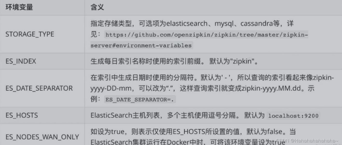 Zipkin 默认是将监控数据存储在内存的,如果 Zipkin 挂掉或重启的话,那么监控数据就会丢 失。所以如果想要搭建生产可用的 Zipkin,就需要实现监控数据的持久化。数据可以存到内存,mysql,elasticsearch和Cassandra中。 Zipkin 支持的这几种存储方式中,内存显然是不适用于生产的。而使用 MySQL 的话,当数据量大时,查询较为缓慢,也不建议使用。 Twitter 官方使用的是 Cassandra作为 Zipkin 的存储数据库,但国内用 Cassandra 的公司较少,而且 Cassandra 相关文档也不多。 综上,故采用 Elasticsearch 是个比较好的选择。 使用docker进行配置(前提已经安装了Elasticsearch): docker run --env STORAGE_TYPE=elasticsearch --env ES_HOSTS=192.168.56.10:9200 openzipkin/zipkin-dependencies 附:使用 es 时 Zipkin Dependencies 支持的环境变量