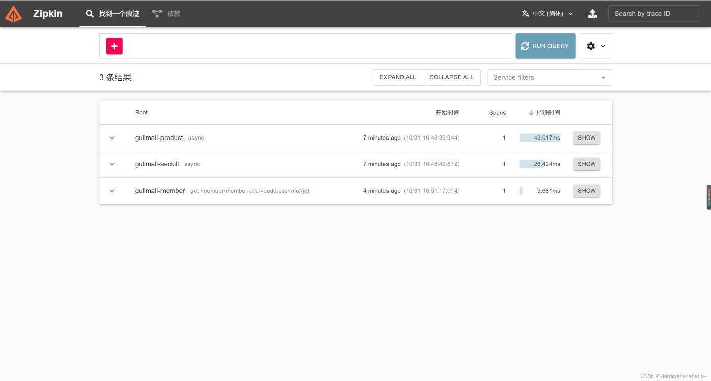 启动服务,进行一系列业务操作,再进入配置中输入的url:http://192.168.56.10:9411/