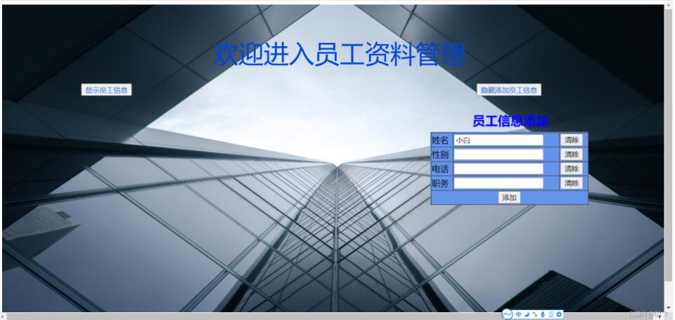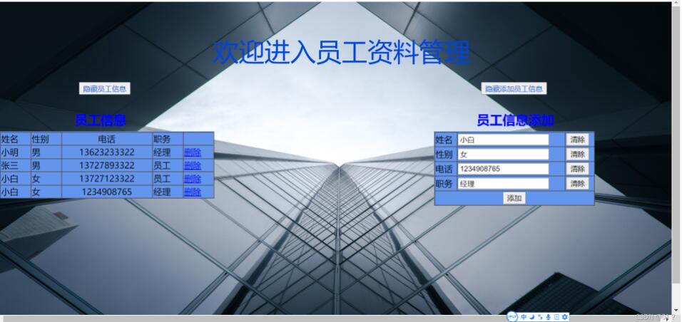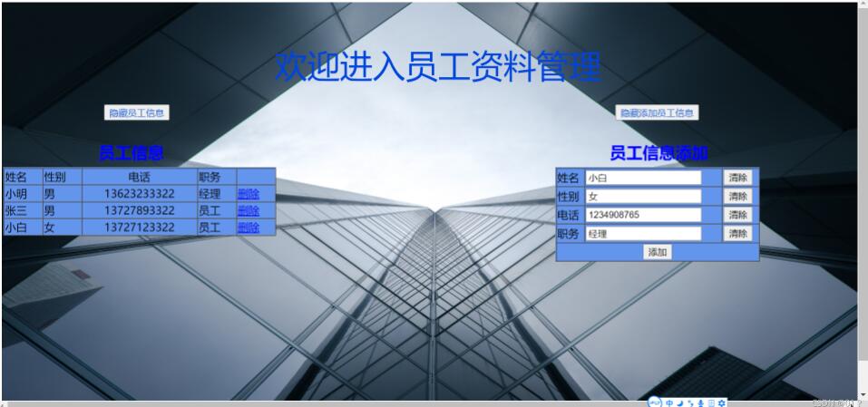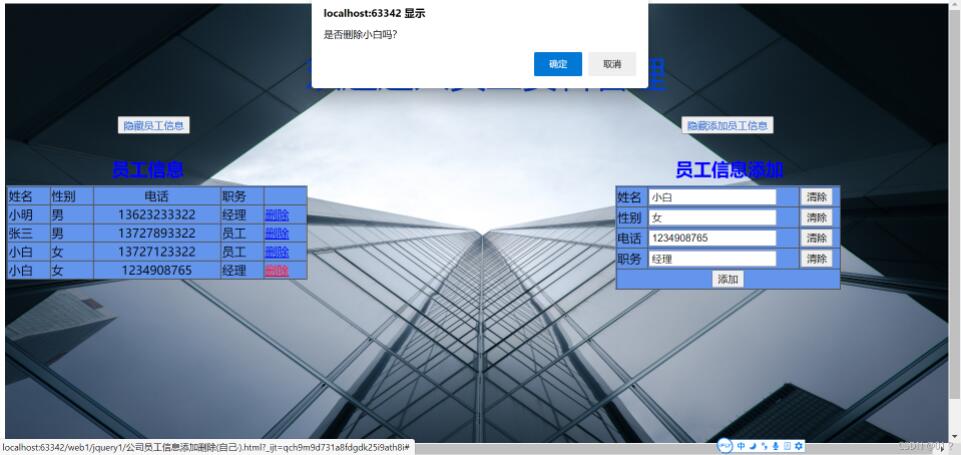 本文实例为大家分享了jquery实现员工信息添加与删除功能的具体代码,供大家参考,具体内容如下