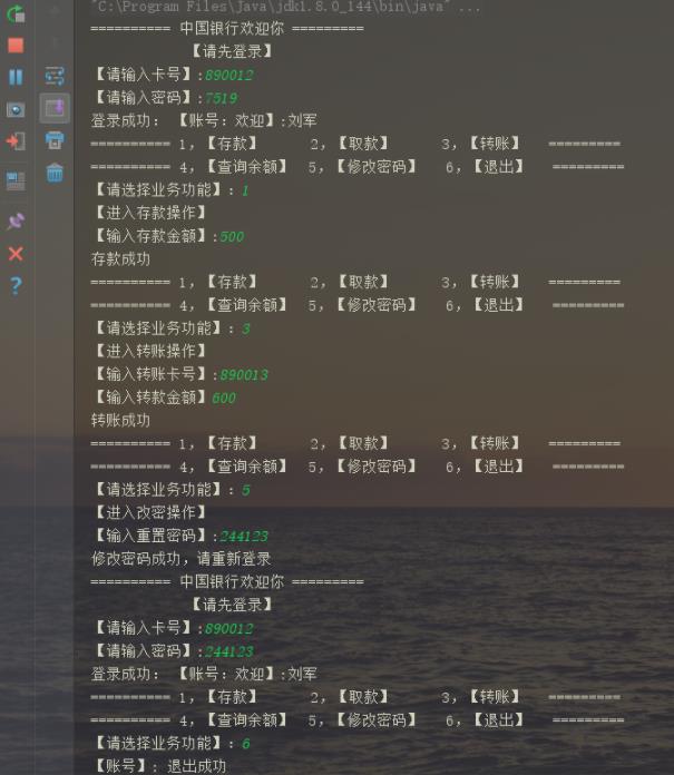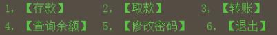 System.out.println("========== 4,【查询余额】 5,【修改密码】 6,【退出】 ========= ");