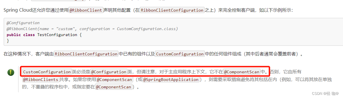 官方文档明确给出了警告:这个自定义配置类不能放在@ComponentScan所扫描的当前包下以及子包下,否则我们自定义的这个配置类就会被所有的Ribbon客户端所共享,达不到特殊化定制的目的了(也就是一旦被扫描到,RestTemplate直接不管调用哪个服务都会用指定的算法)。
