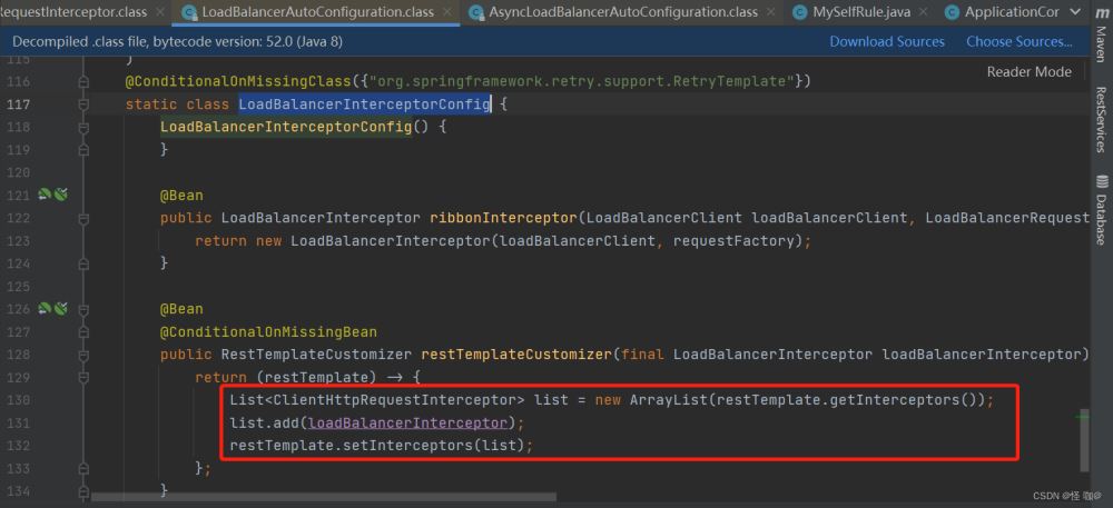 定义了拦截器,自然需要把拦截器注入到、RestTemplate才能生效,那么Ribbon中是如何实现的?上面说了拦截器的定义与拦截器注入器的定义,那么肯定会有个地方使用注入器来注入拦截器的。