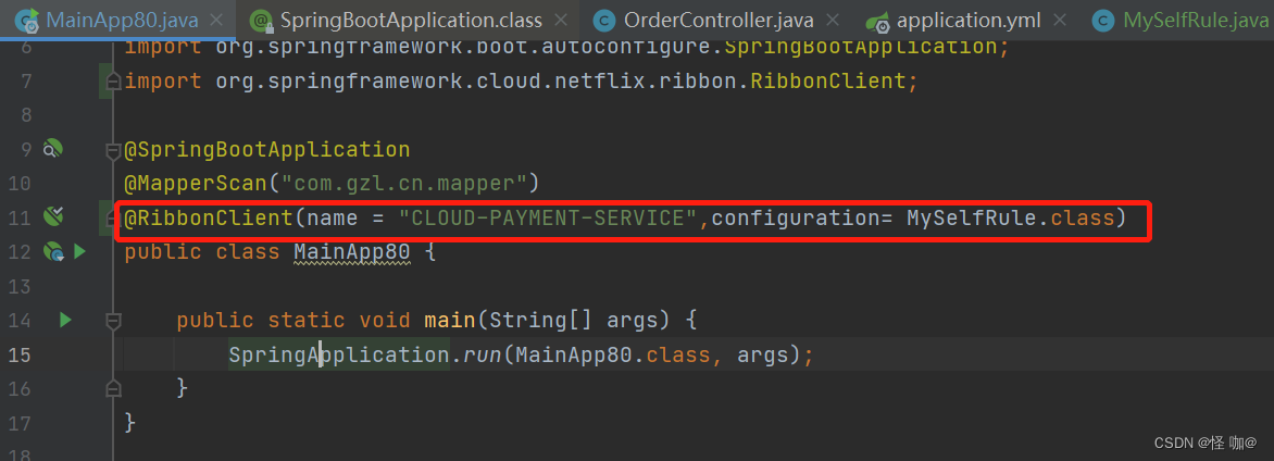 @RibbonClient(name = "CLOUD-PAYMENT-SERVICE",configuration= MySelfRule.class)