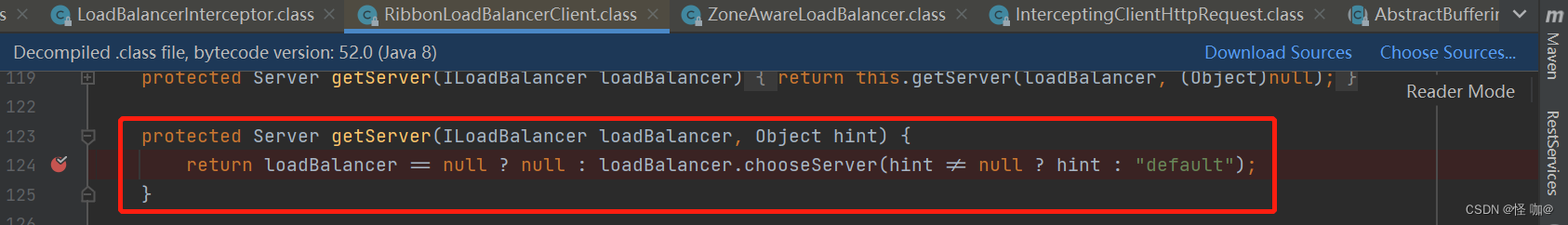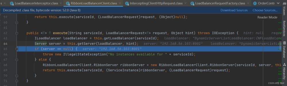 RibbonLoadBalancerClient就是Ribbon当中的类了。由此可以看出框架有时候就是这样,来回套用,cloud对外提供API,然后组件进行真正的实现,假如感觉ribbon满足不了我们,我们完全可以按照cloud的API来开发新的负载均衡框架,进行无缝替换。