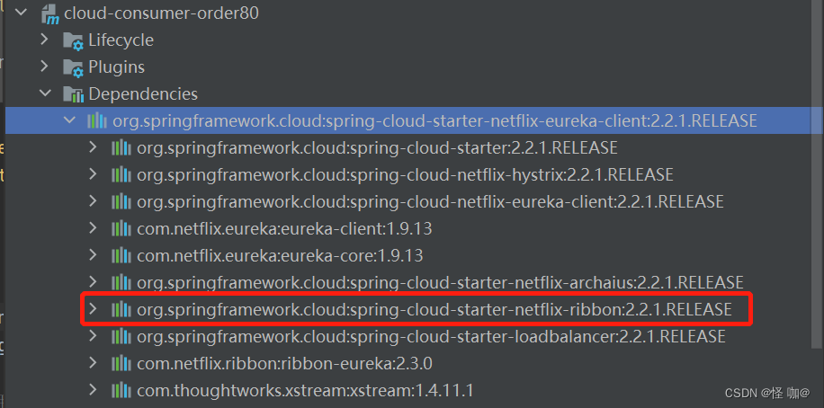 猜测spring-cloud-starter-netflix-eureka-client自带了spring-cloud-starter-ribbon引用
