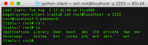 上述命令就是ssh连接的命令 -p后边紧跟的是上述转发的端口,执行上述命令后,结果如下: