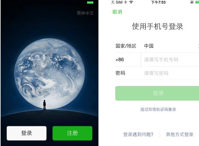 “断点”这个东西在iOS开发中可谓是经常使用的东西,接下来我们要做的就是给在微信点击登录进行页面跳转时添加一个断点。就是点击左边截图的登录按钮往右边页面跳转时添加一个断点。我们暂且将断点添加在右边页面的初始化方法中。