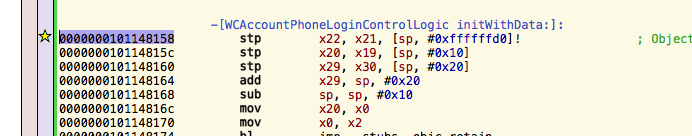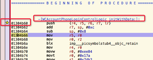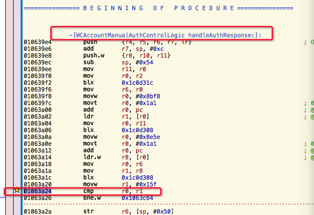 接下来我们将要通过一个实例来实战一下register write这个命令,通过在Hopper中对登录模块的分析,我们不难发现“WCAccountManualAuthControlLogic”这个类中的“handleAuthResponse:”方法就是用来处理“登录认证响应”的方法。也就是说“handleAuthResponse:”负责处理登录业务逻辑的网络响应,并且在这个函数的前边有一个比较(cmp r0, r1), 根据r0和r1的比较结果来进行跳转。