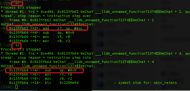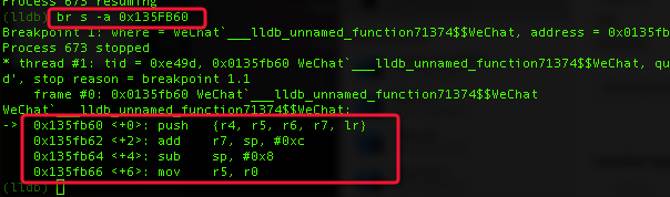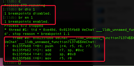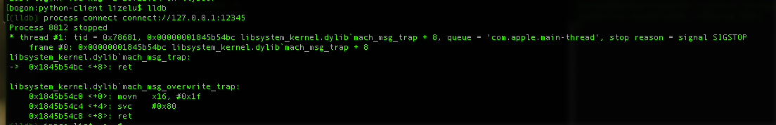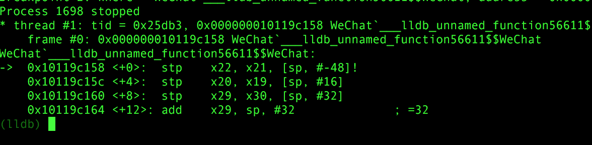 下方是连接后的结果,LLDB与debugserver建立完成后,我们就可以使用lldb来调试微信这个应用了。