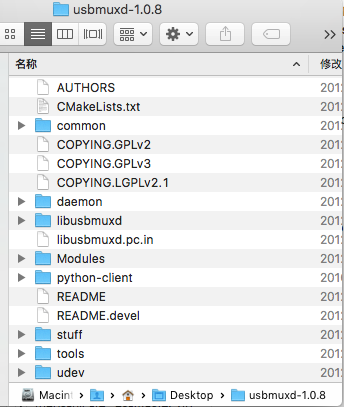 usbmuxd虽然目前最新的版本是1.1.0,但是1.1.0版本和1.0.9版本仅支持Linux系统,也就是说我们的Mac还是得下载v1.0.8的版本,下载地址(usbmuxd-v1.0.8)。下载完后,将下载的文件进行解压,内容如下所示: