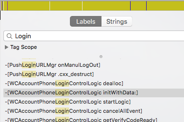要给上述右边页面添加断点首先得知道上面“手机号登录”视图控制器的内存地址,然后才可以使用LLDB添加断点。那么寻找上述视图控制器的内存地址的任务就交给了我们的Hopper来做了。在Hopper中我们搜索“Login”,然后会筛选出好的带有Login关键字的ViewController,然后我们在筛选的结果中再次寻找可疑目标对象。然后我们找到了一个名为“WCAccountPhoneLoginControlLogic”(我们可以翻译一下英文,大概意思就是“微信手机账号登录控制逻辑”)的类,从这个类的名字中我们不难推断出该类极有可能就是我们要寻找的“手机账号登录”页面。