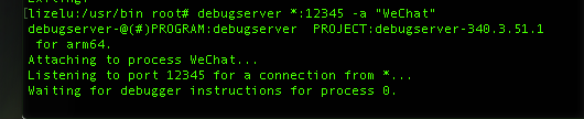 在越狱设备中,我们就可以通过下方命令行来开启debugserver了,我们此处以调试微信App为例。下方的命令就是启动debugserver来监听来自任何IP地址的接入,iOS设备的接入端口是12345,所要调试的App为“WeChat”。命令如下: